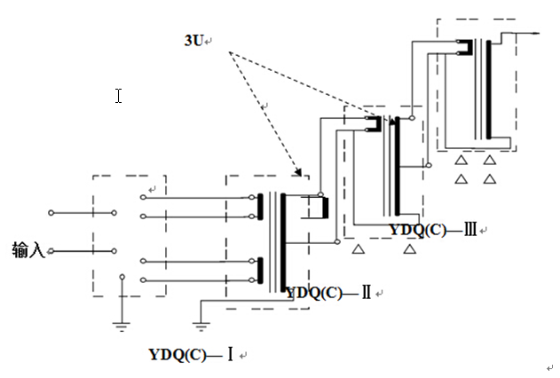 YDQ(C)系列高壓試驗(yàn)裝置,除最高電壓一級(jí)外,都在高壓繞組中串繞激磁組。該繞組和后一級(jí)試驗(yàn)變壓器初級(jí)線圈參數(shù)相同。