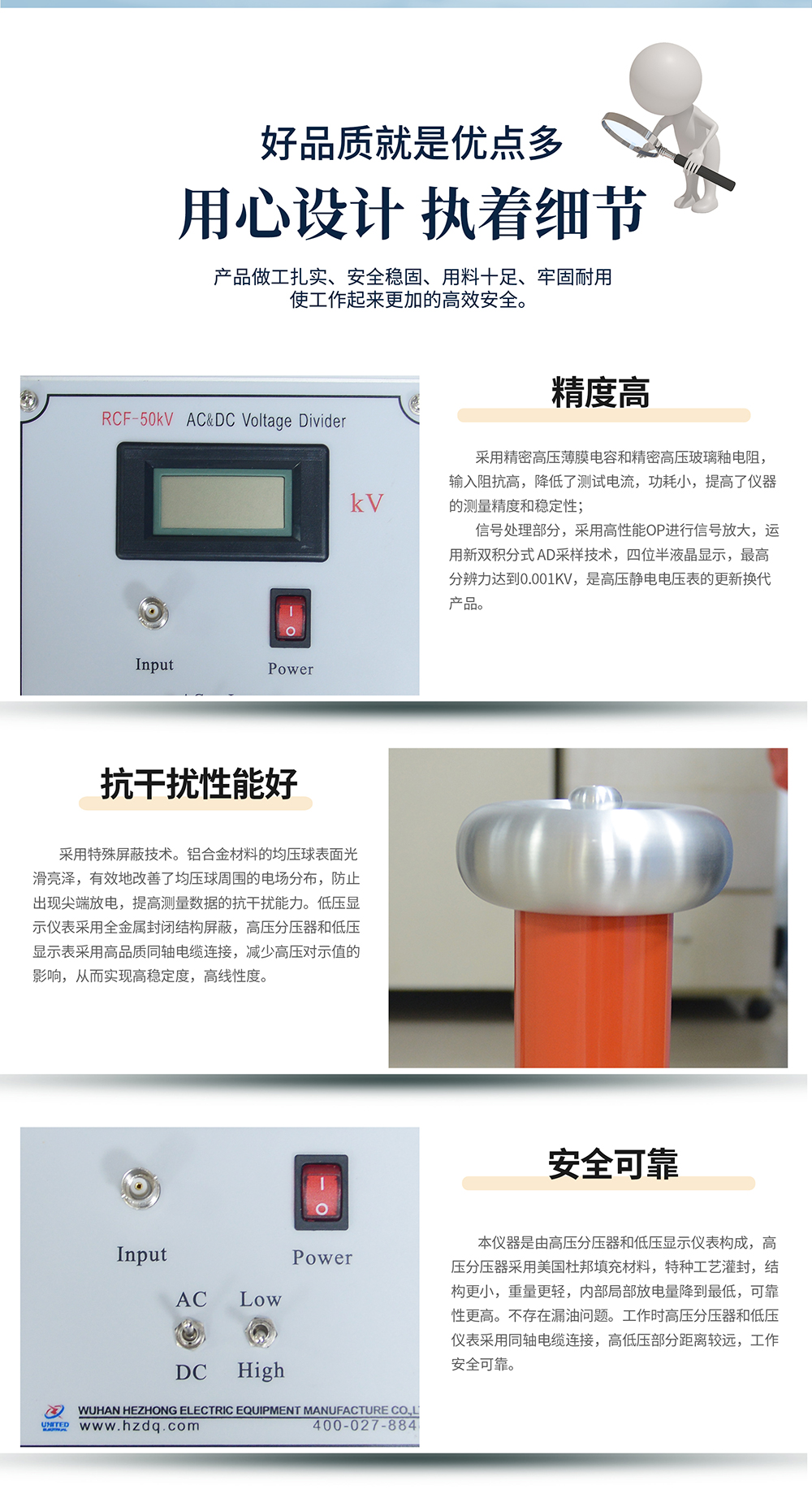 采用特殊屏蔽技術。鋁合金材料的均壓球表面光滑亮澤,有效地改善了均壓球周圍的電場分布,防止出現尖端放電,提高測量數據的抗干擾能力。低壓顯示儀表采用全金屬封閉結構屏蔽,高壓分壓器和低壓顯示表采用高品質同軸電纜連接,減少高壓對示值的影響,從而實現高穩定度,高線性度。