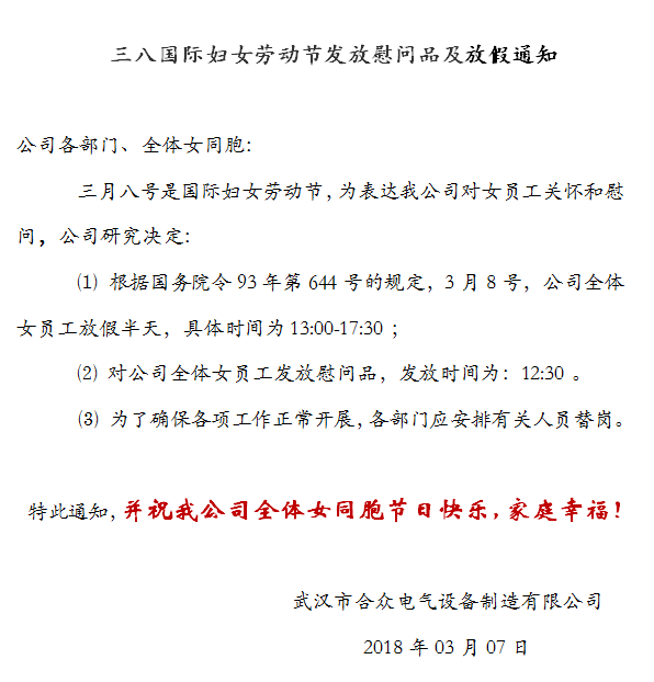 關(guān)于三八婦女節(jié),合眾電氣全體女員工放假的通知: