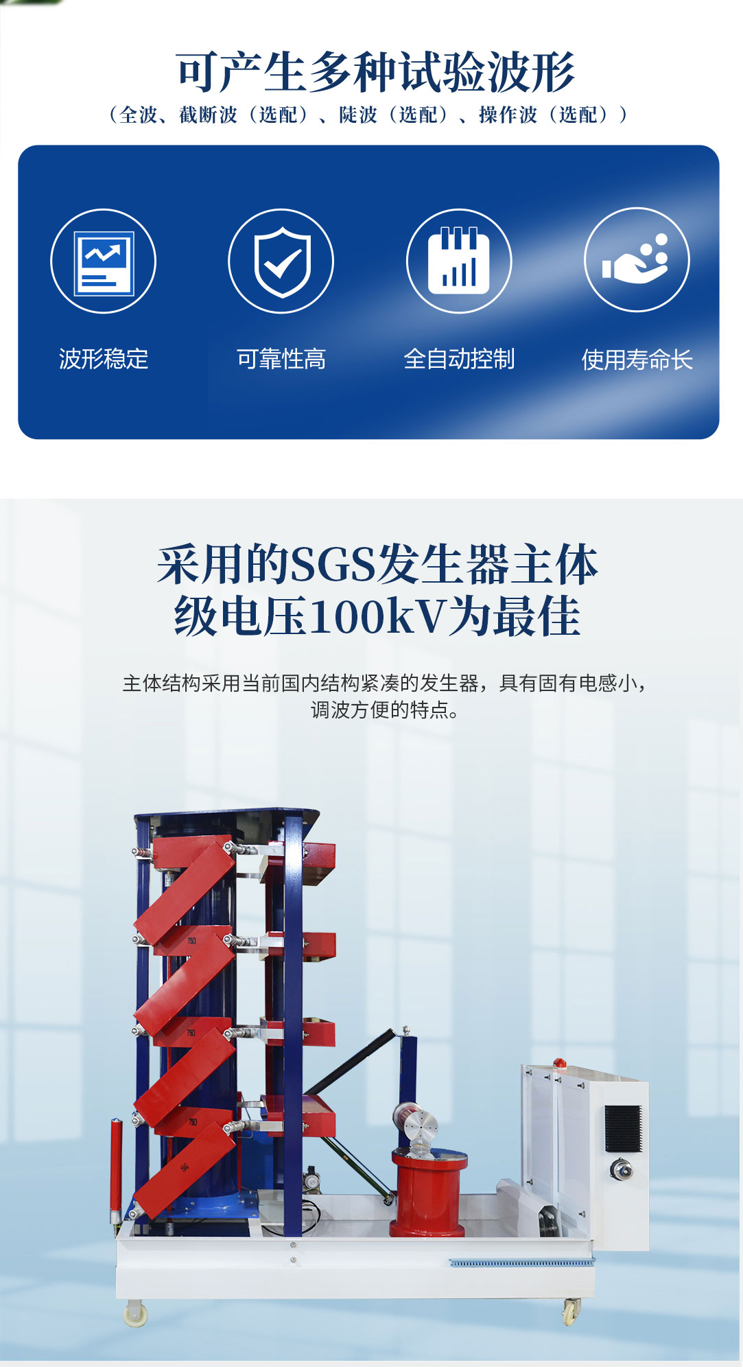 1、采用的SGS發生器主體,級電壓為100kV,符合當前國內外的發展趨勢。主體結構采用當前國內結構緊湊的發生器,具有固有電感小,調波方便的特點。