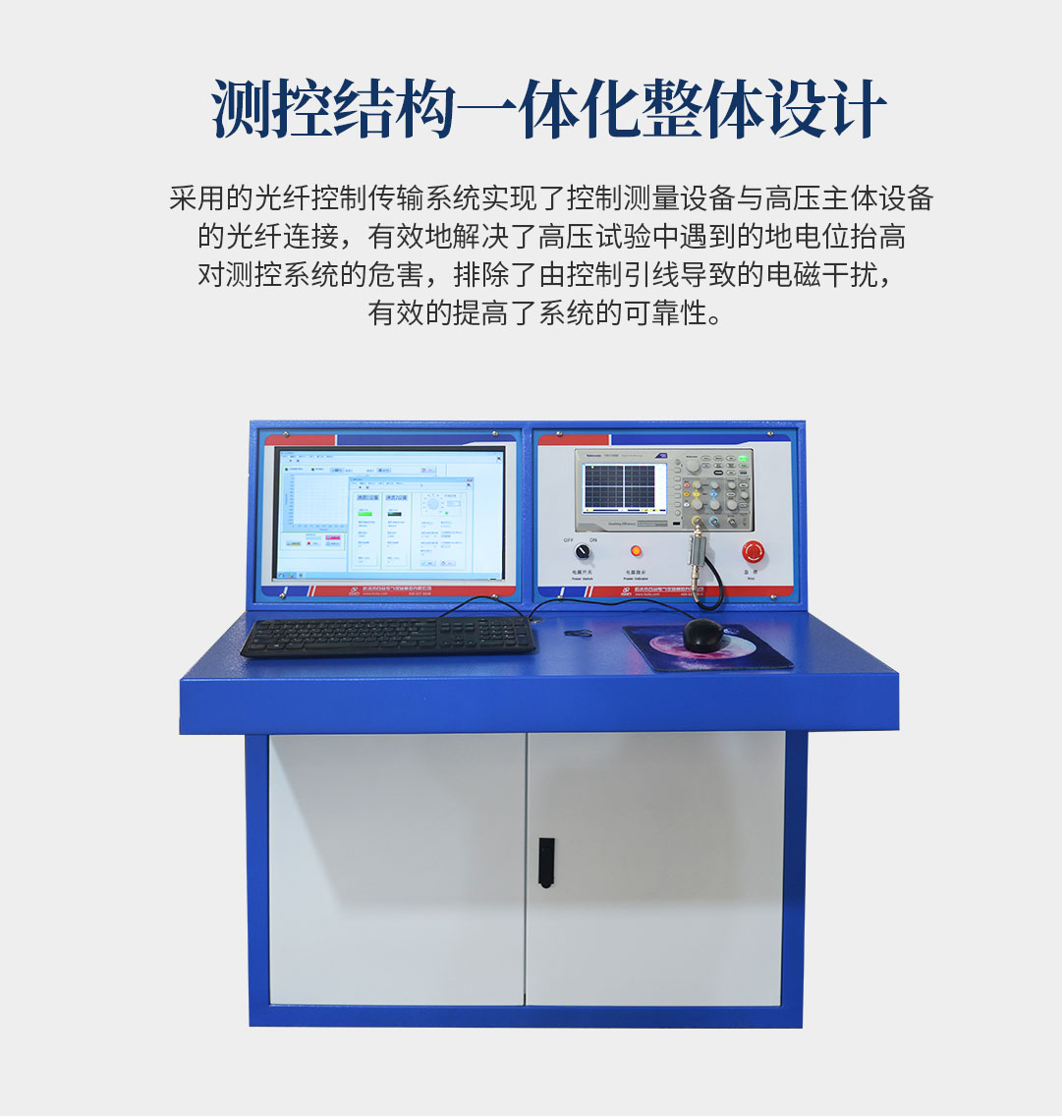 4、采用的光纖控制傳輸系統在國內高壓試驗設備中是創新,它實現了控制測量設備與高壓主體設備的光纖連接,有效地解決了高壓試驗中遇到的地電位抬高對測控系統的危害,排除了由控制引線導致的電磁干擾,極大地提高了系統的可靠性。