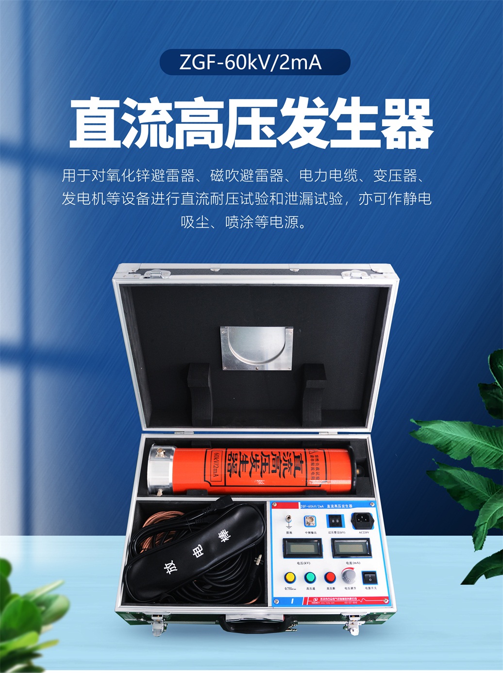本儀器適用于電力、鐵路、化工、工礦、冶金、鋼鐵等部門對氧化鋅避雷器、磁吹避雷器、電力電纜、變壓器、發(fā)電機等設(shè)備進行直流耐壓試驗和泄漏試驗,亦可作靜電吸塵、噴涂等電源。