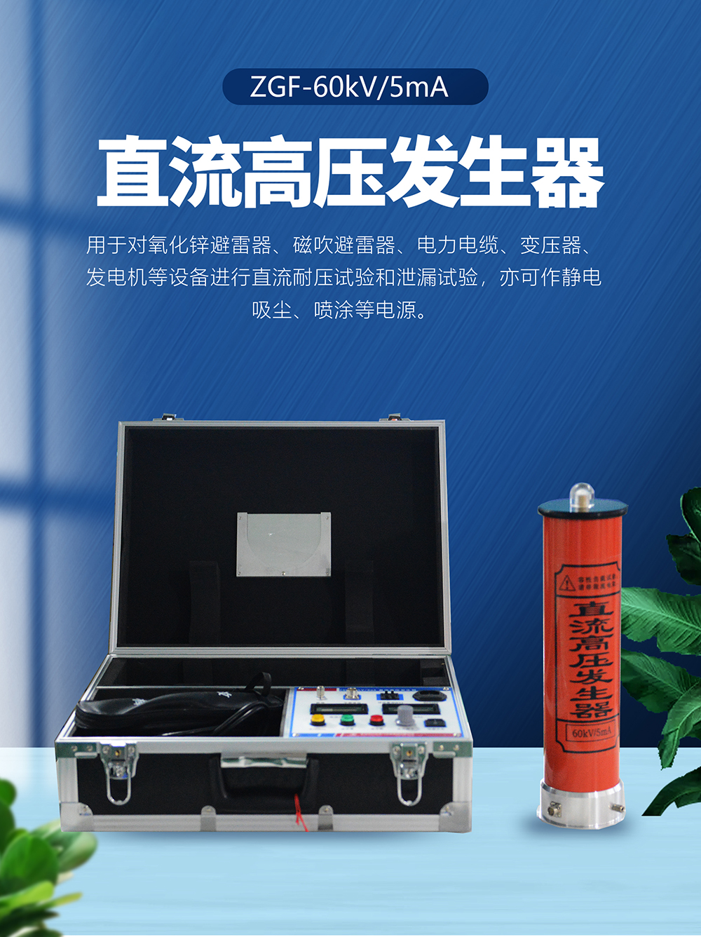 本儀器適用于電力、鐵路、化工、工礦、冶金、鋼鐵等部門對氧化鋅避雷器、磁吹避雷器、電力電纜、變壓器、發電機等設備進行直流耐壓試驗和泄漏試驗,亦可作靜電吸塵、噴涂等電源。