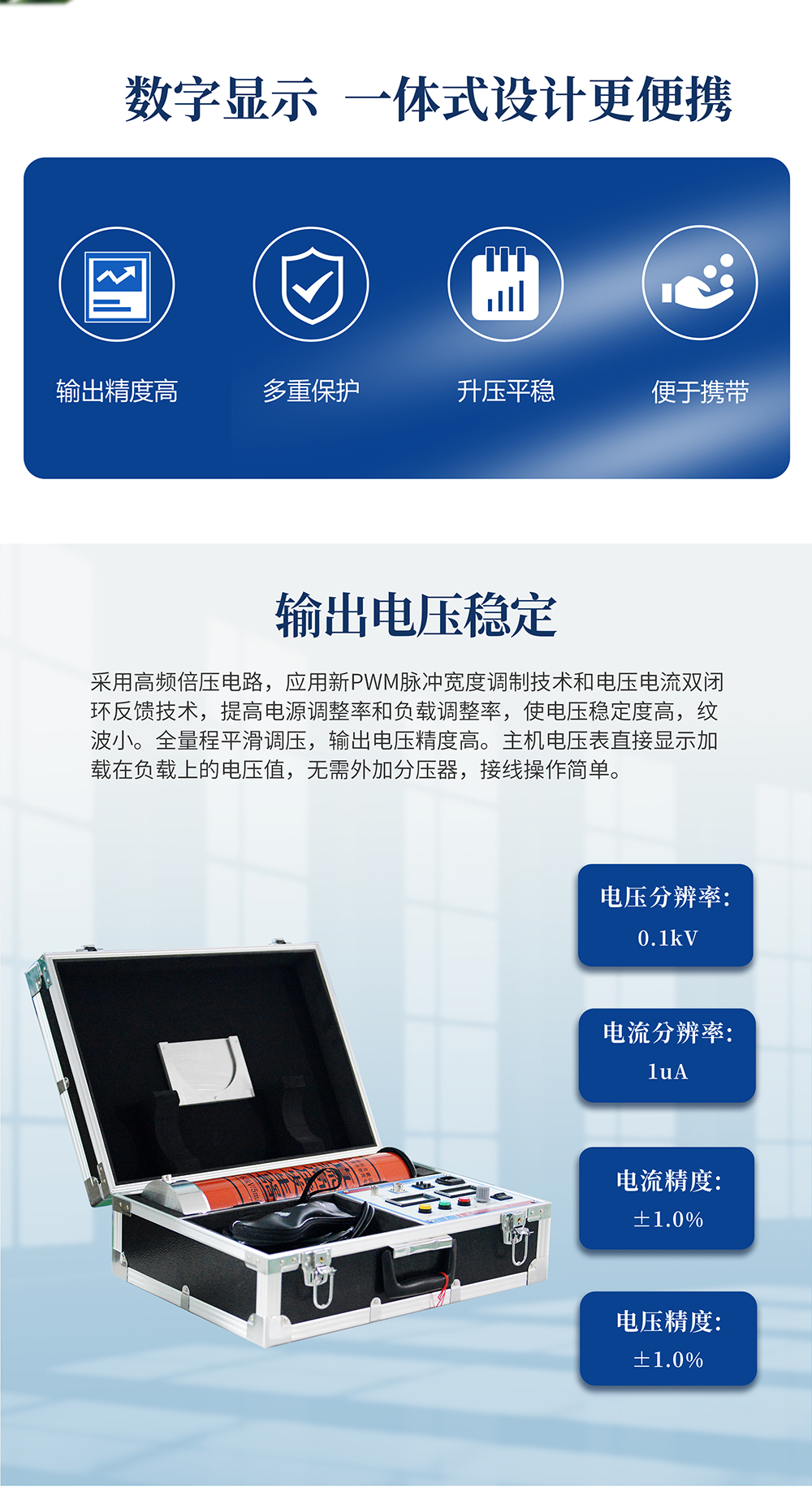 2、保護全面:保護功能齊全,具有零位保護、過壓保護、過流保護、擊穿保護,保護電路選用納秒級專用傳感器,動作迅速可靠,有效保障人身及設備安全。