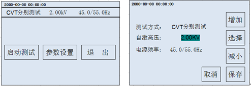 首先根據相應的接線提示接好儀器外部的連線,然后點擊主界面“CVT測試”選項,進入下一級CVT測試菜單(如圖5-5)。然后可以點擊“參數設置”進去設置菜單(如圖5-5)進行詳細的測試參數設置。分別點擊每個需要設置的項目,按“增加”“減小”或“選擇”來修改。修改完成后點擊“保存”即可保存剛才所修改的參數并返回CVT測試界面,點擊“取消”則不保存本次修改并返回CVT測試界面。