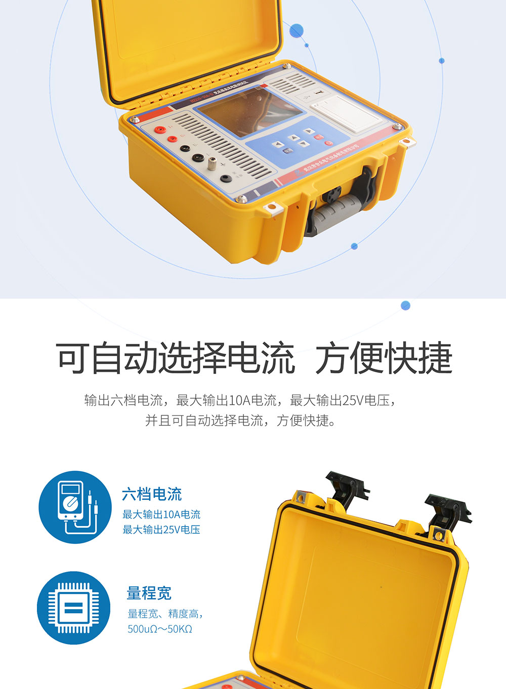 1、鋰電池供電或者220V交流供電自適應(yīng),一次充電,可連續(xù)進行上百臺變壓器直流電阻測試,測試過程簡單、方便。