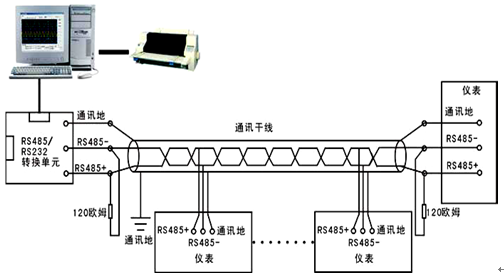 (4)當一臺計算機掛多臺記錄儀時,網絡拓撲結構為總線型,每臺記錄儀通過支線并接在干線上。需注意的是終端電阻要接在通訊干線的兩端,分支后的傳輸線要盡可能的短,以減少干擾。