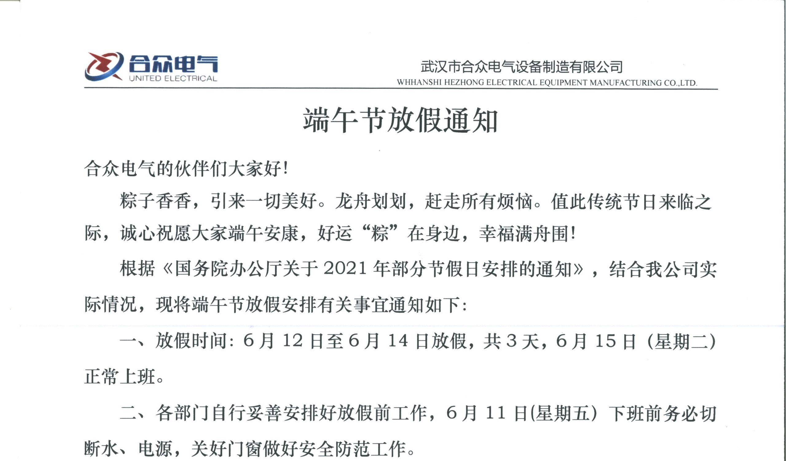 端午安康 武漢市合眾電氣端午節(jié)放假通知