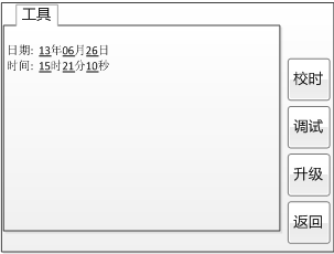 智能互感器測試儀系統(tǒng)工具界面,如圖10。在該界面中可以進行時間校對、系統(tǒng)升級等操作。其中:調(diào)試用于出廠調(diào)試,升級用于軟件界面的升級。