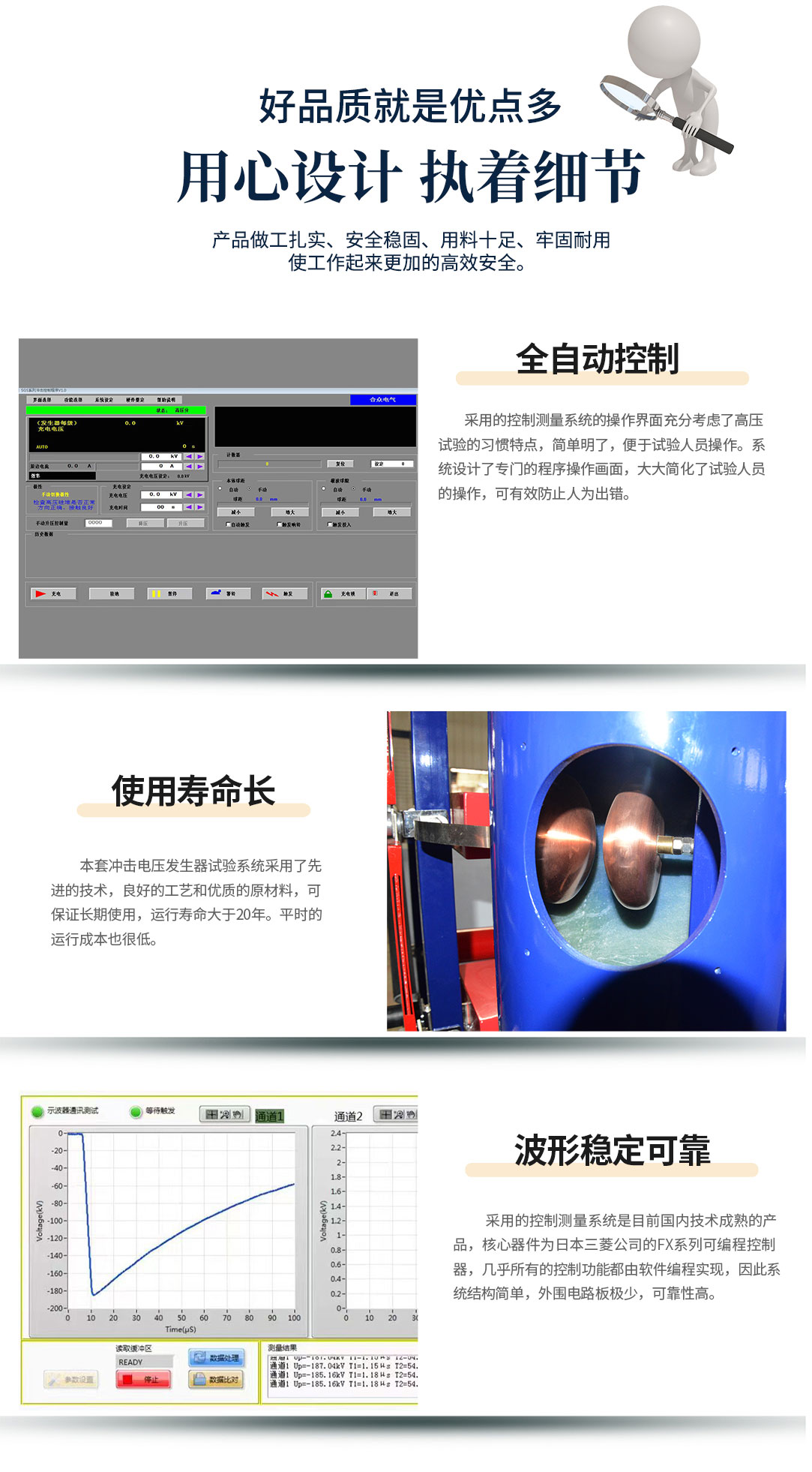 波頭時間:1.2±30%μs,波尾時間:50±20%μs,過沖:小于5%,效率:不低于90%?!?.2/50μs標準雷電沖擊電壓全波,效率大于90%。