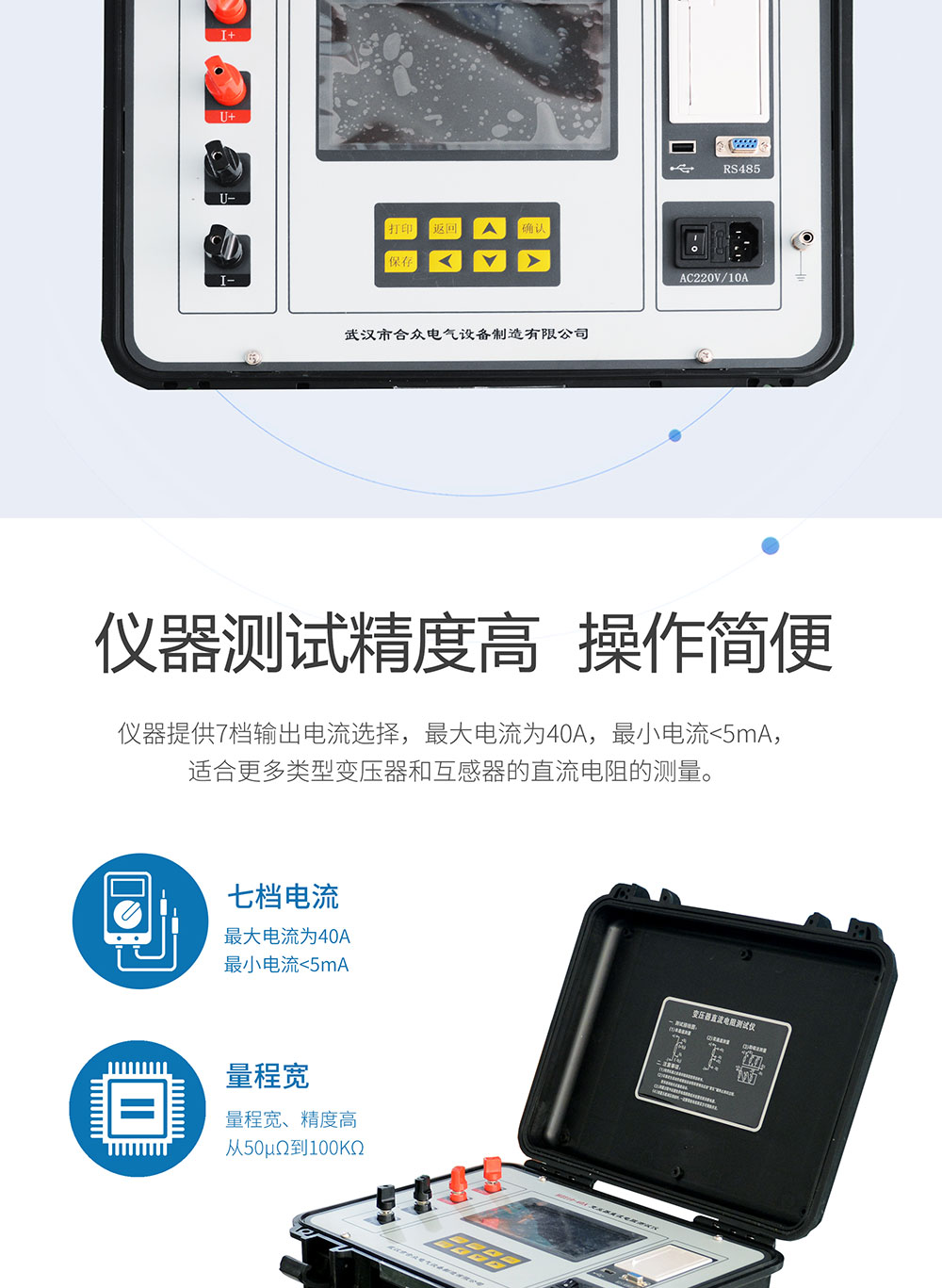 1、儀器提供7檔輸出電流選擇,最大電流為40A,最小電流<5mA,適合更多類型變壓器和互感器的直流電阻的測量。