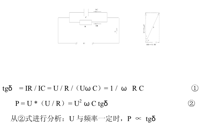電介質的損耗:絕緣材料在電場的作用下會產生泄漏電流和極化現象,這必然伴隨著材料的發熱和能量的損失。它可分為:電導損耗(既電導電流使介質發熱,交直流電場中都有)、游離損耗(電壓高于某一值時,局部放電,電壓越高,損耗越大,在交直流電場中都存在)、極化損耗(只在交變電場中存在,偶極子扭來扭去,產生摩擦損耗和內部電場電勢的平衡形成的電流產生的損耗)。一般用tg6來表述電介質的損耗,它只與絕緣材料的性質有關,而與它的結構、形狀、幾何尺寸無關,有以下公式判斷比較: