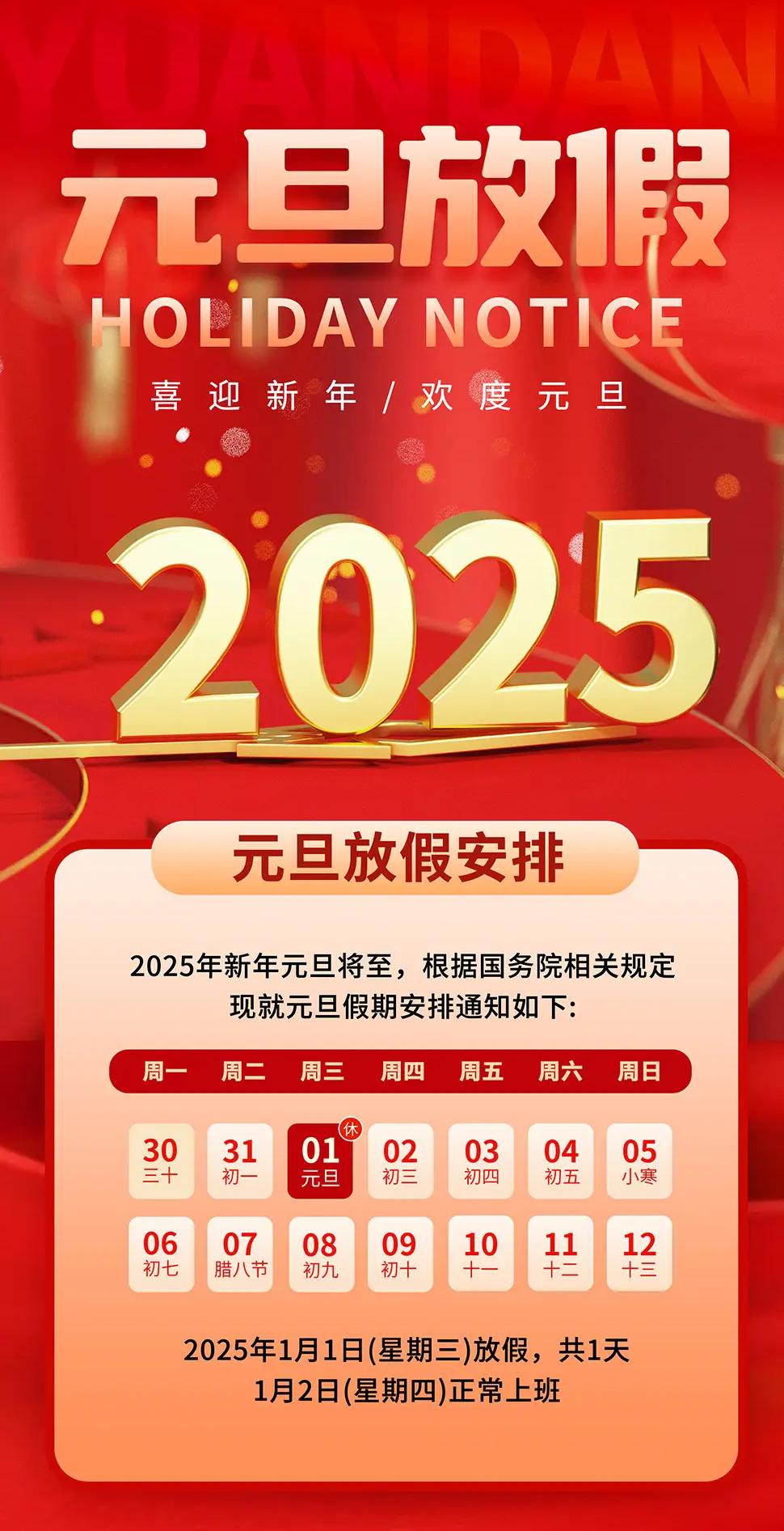 根據《國務院辦公廳關于2025年部分節假日安排的通知》,結合公司實際情況,現將元旦放假安排的有關事宜通知如下: